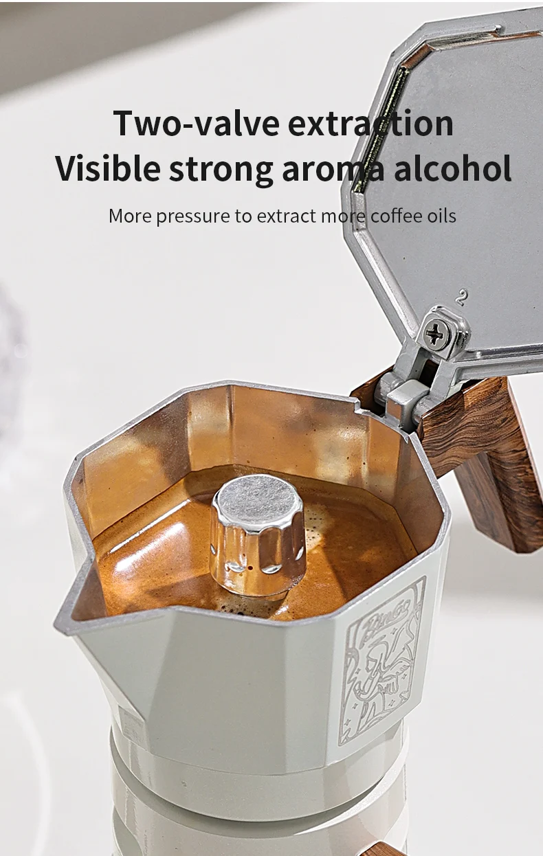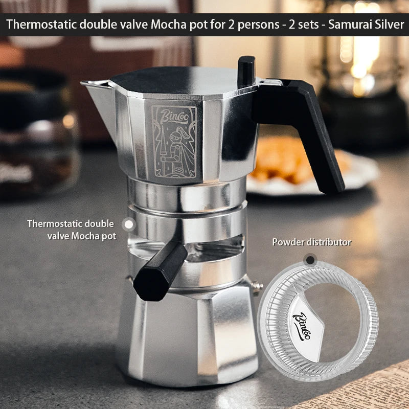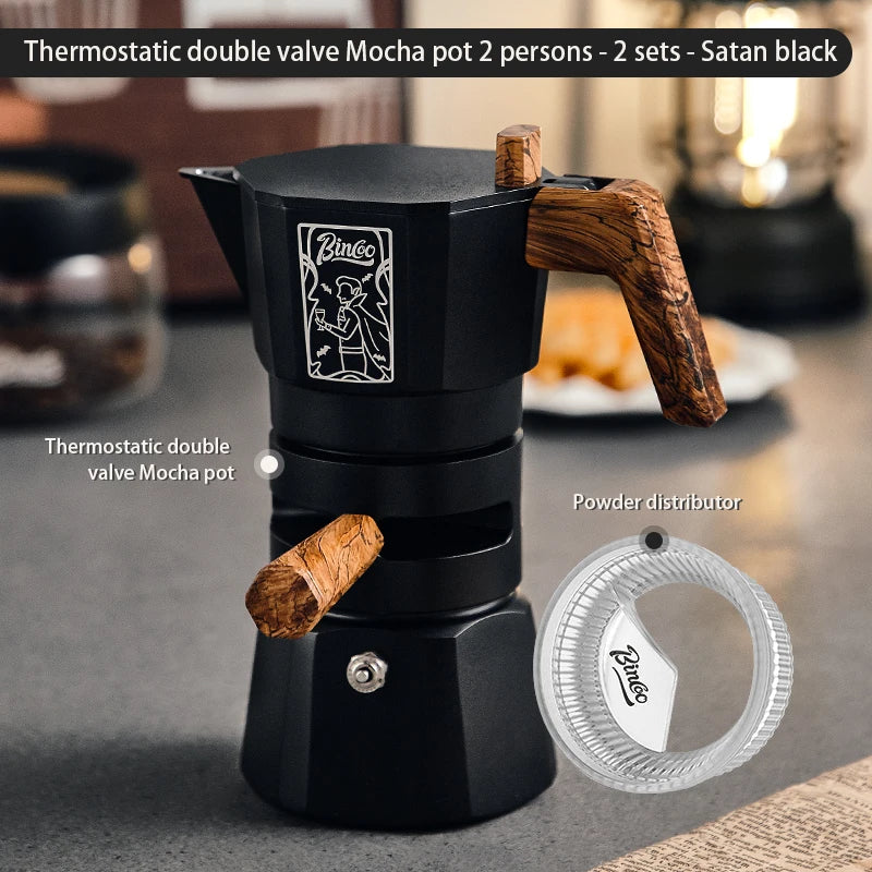 The Bincoo Moka Pot features a thermostatic double valve, ensuring precise temperature control for optimal espresso extraction.