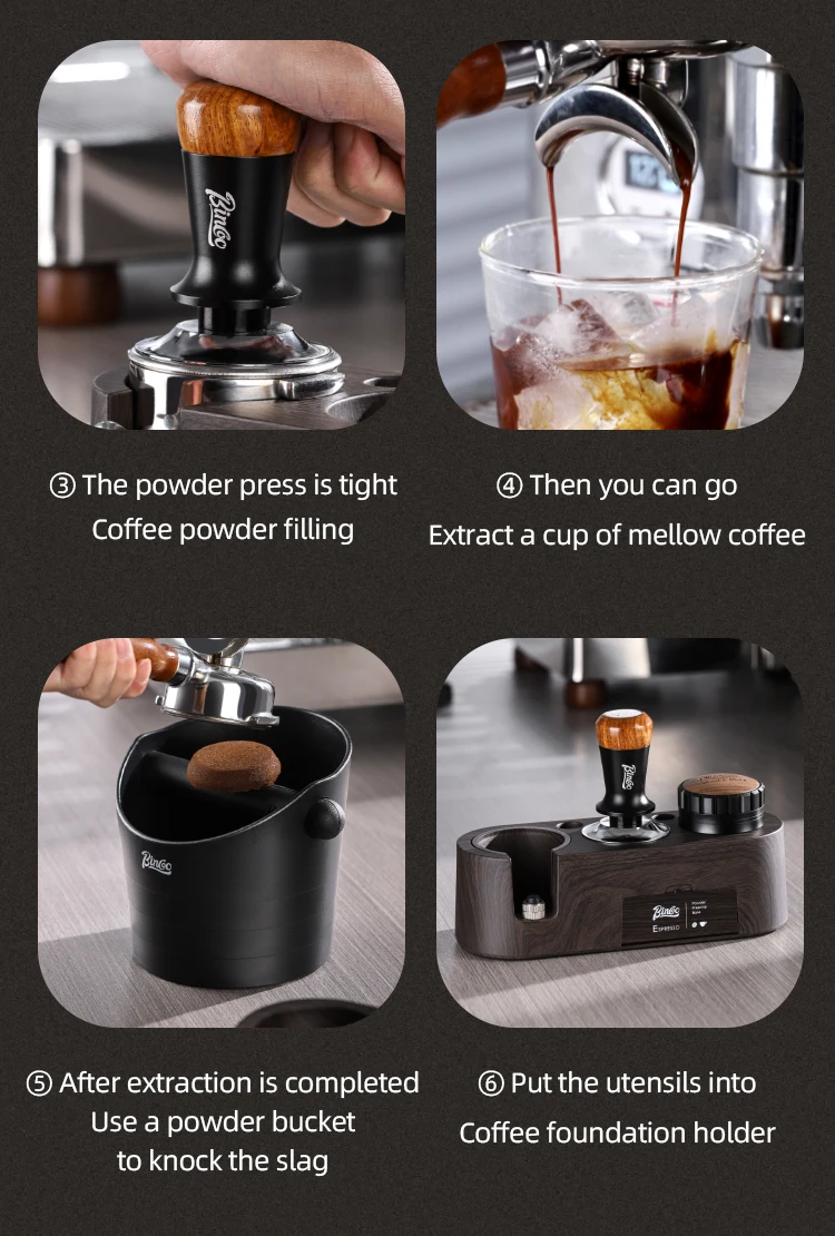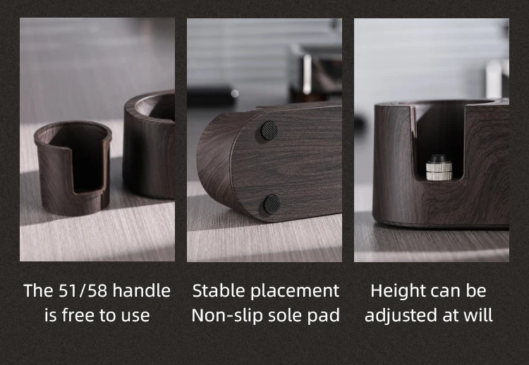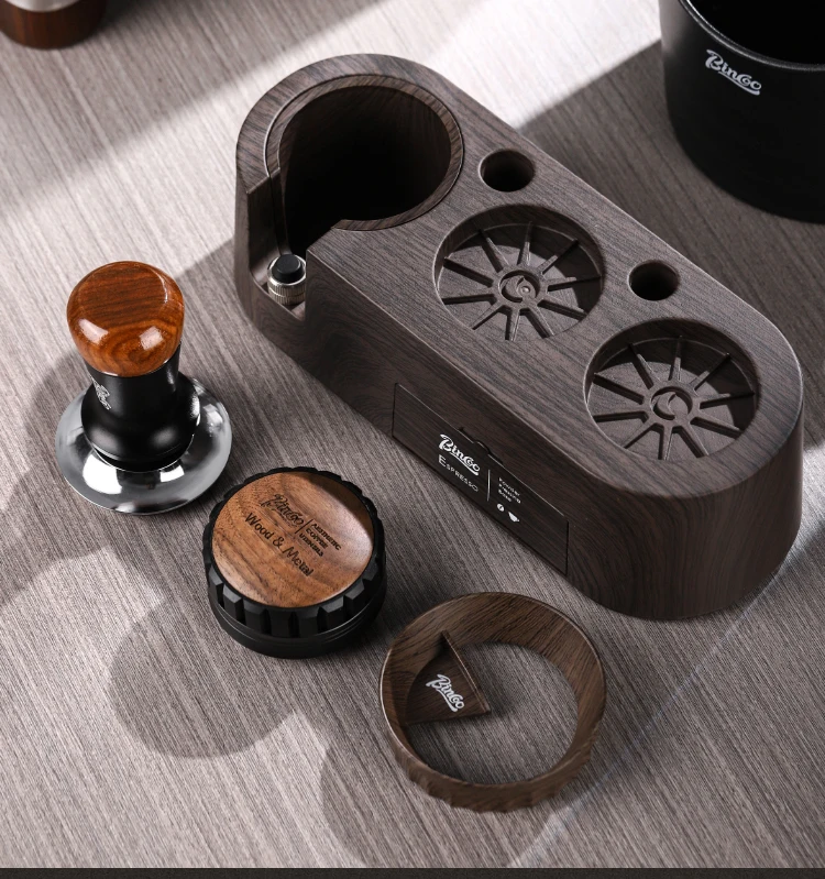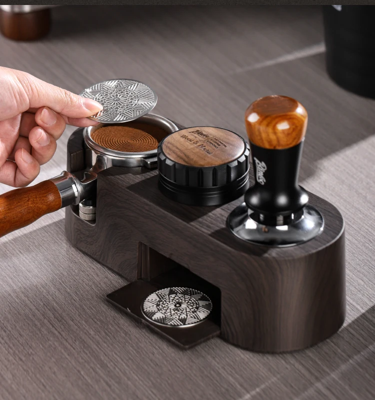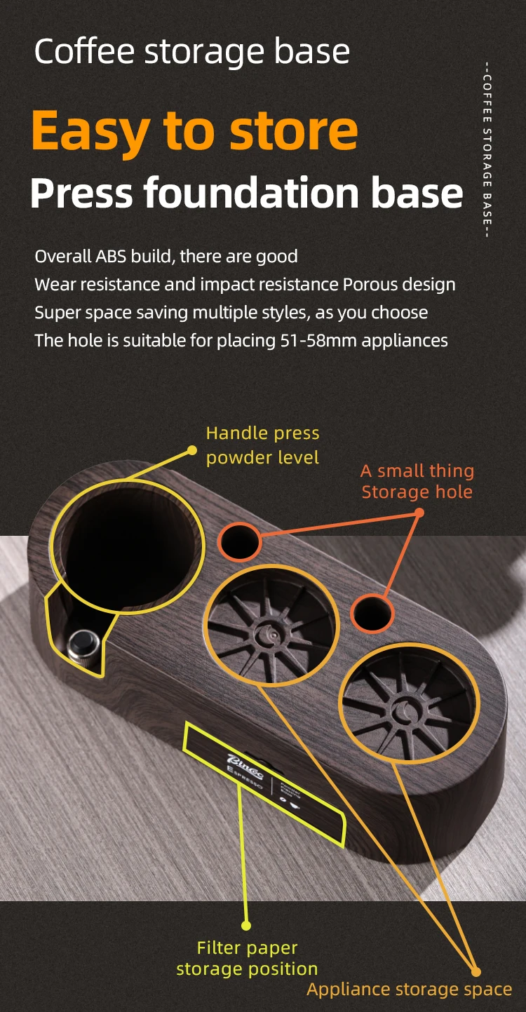 The included coffee hammer tamper storage base keeps your tools organized and within reach during use.