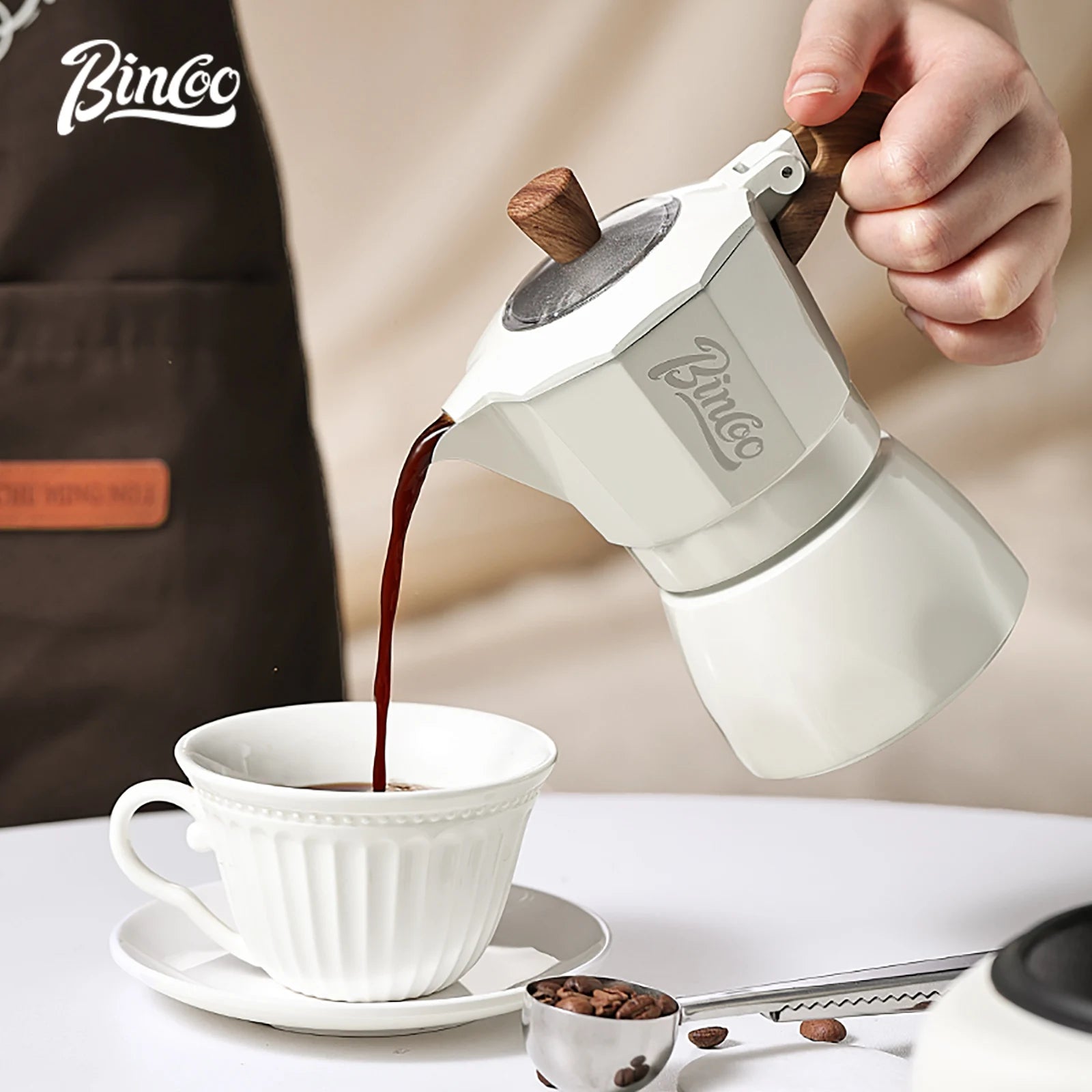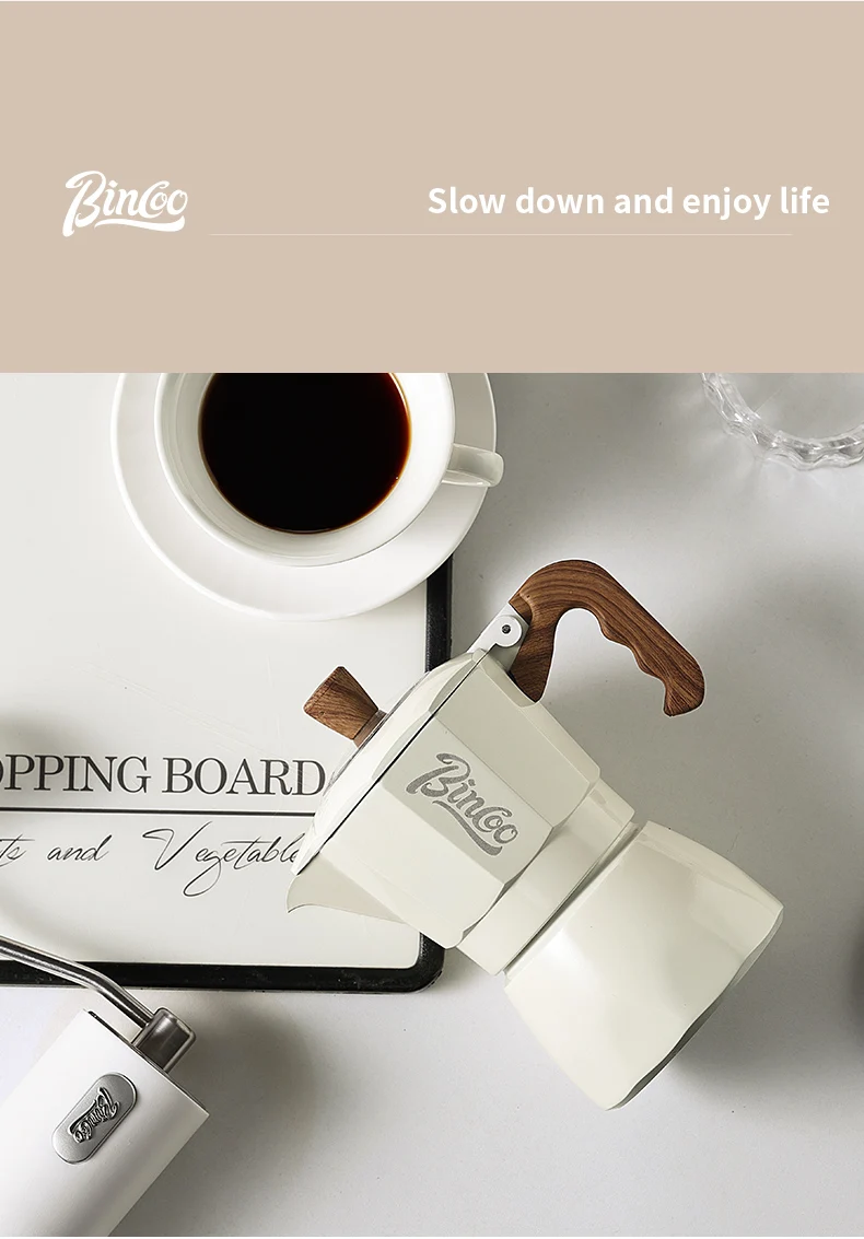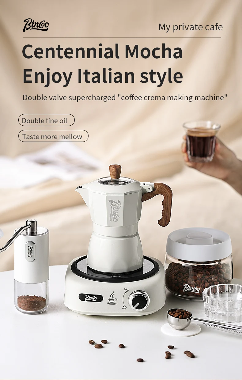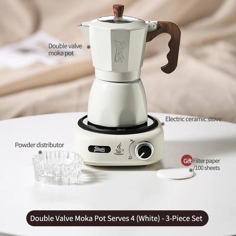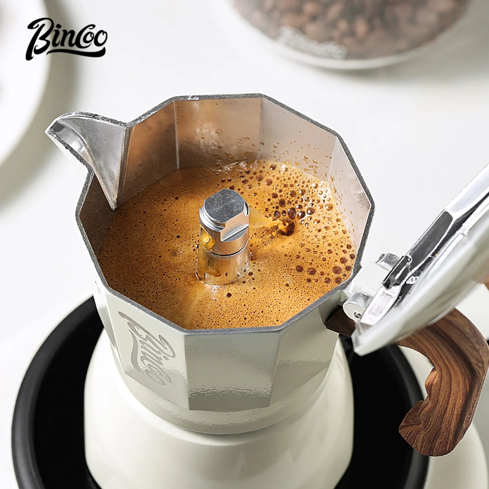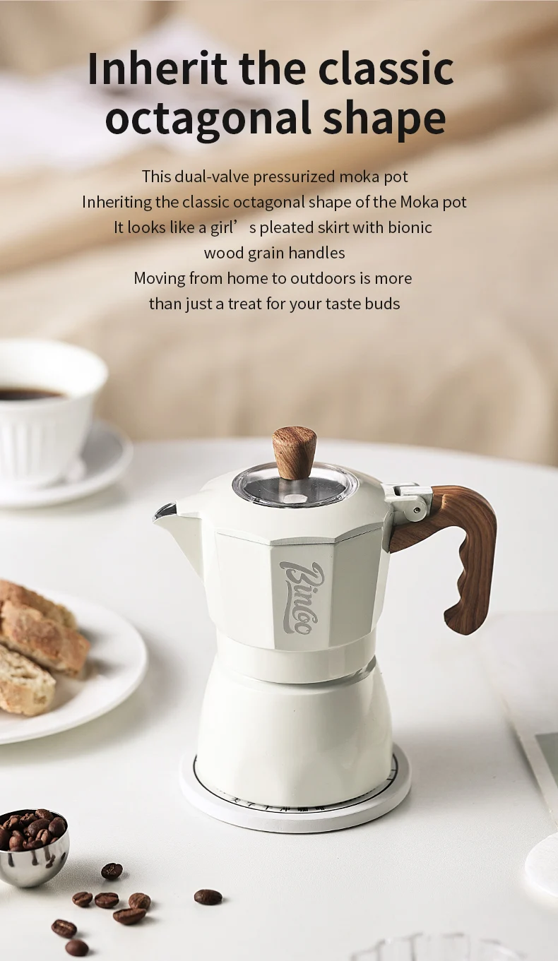 The Bincoo Double Valve Mocha Pot features a unique double valv system for precise espresso extraction.