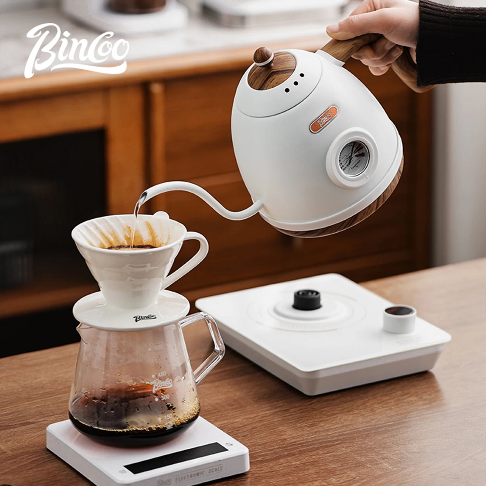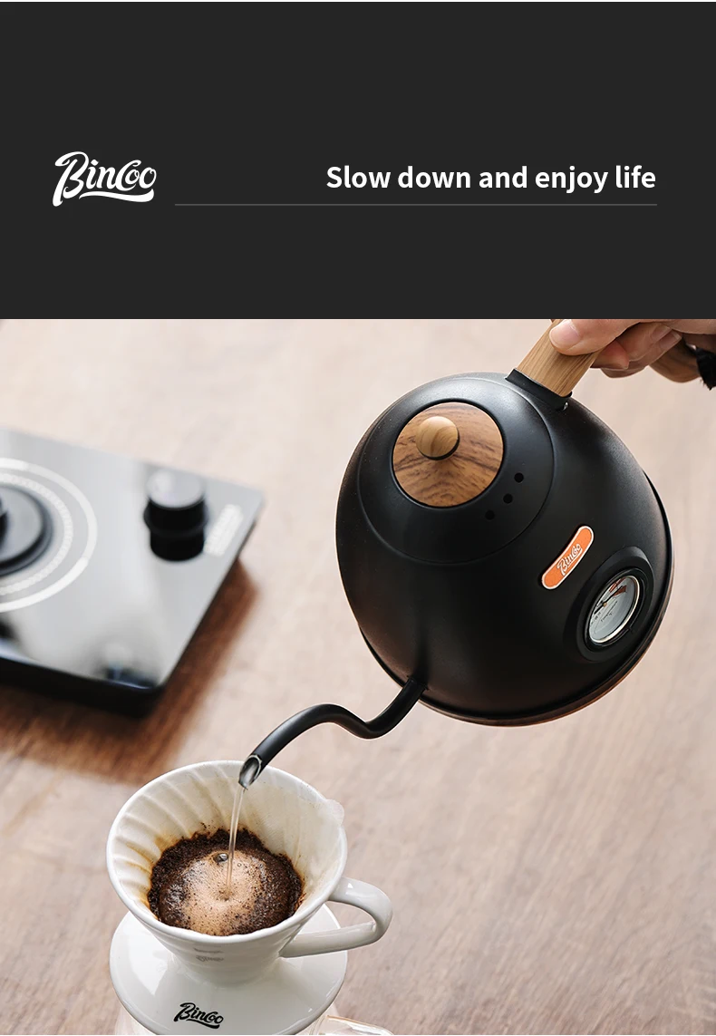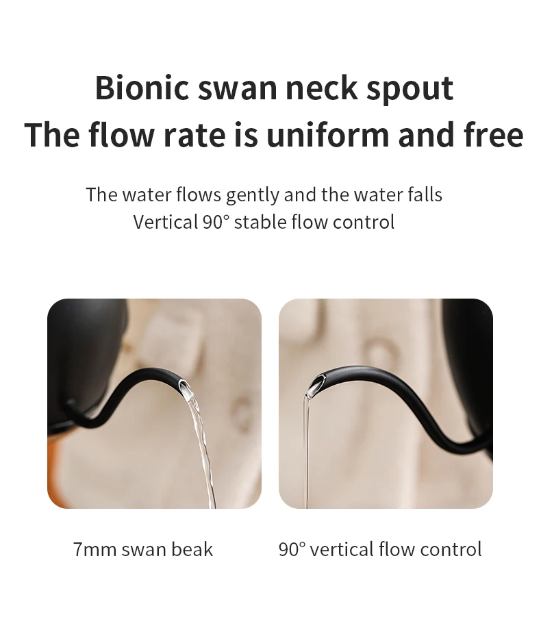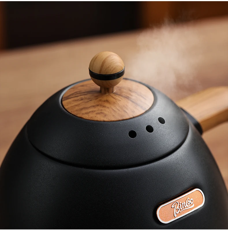 The gooseneck spout provides precise flow control, ideal for hand brewing techniques.