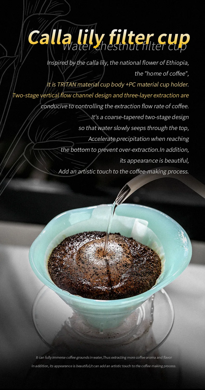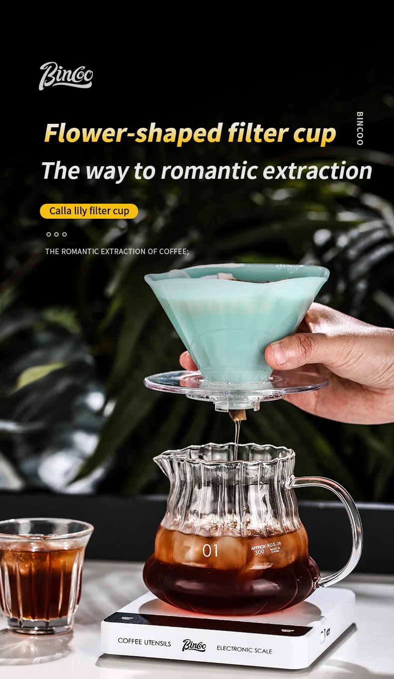 The Bincoo Pour Over Coffee Dripper features a calla lily shape, adding a touch of elegance to your coffee brewing process.